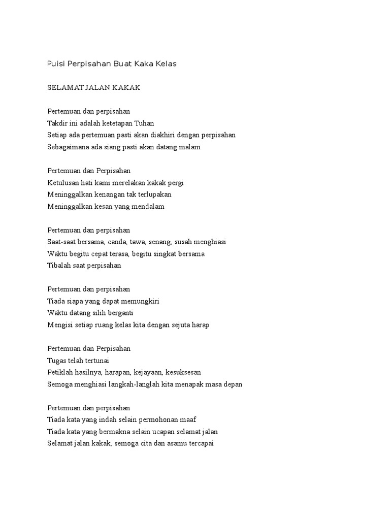 Pastikan dia tahu bahwa kamu begitu menyayanginya. 2 Contoh Puisi Perpisahan Sekolah Untuk Sahabat atau Teman. Berikut adalah kumpulan puisi perpisahan lengkap.